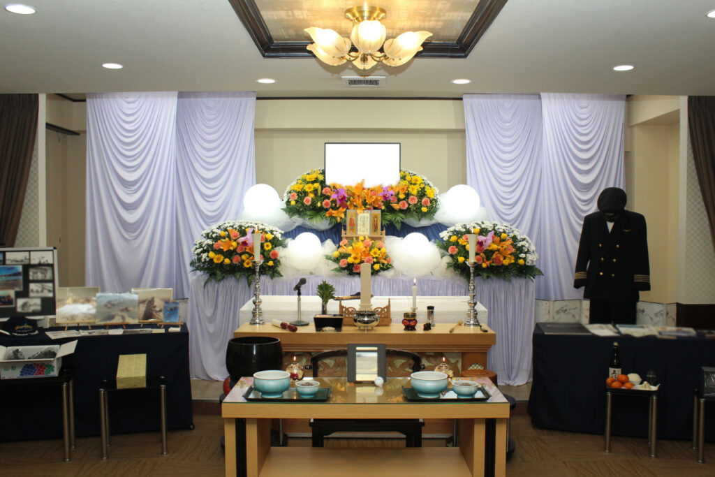 ご家族・ご親族様を中心に、家族葬にて執り行いました。生花祭壇の両側にはメモリアルコーナーを設け、思い出のお写真などを飾らせていただきました。参列された皆様は当時を懐かしまれながら、故人様との思い出を語り合っておられました。故人様は入院生活が長く、なかなかご自宅へ帰ることができなかったとのことでしたので、ご出棺の際にはご自宅の前を通り、火葬場へ向かいました。ご家族様のお気持ちが随所に感じられる、穏やかなご葬儀となりました。