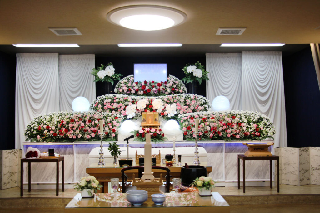 故人様は病院にてご逝去され、その後、ご自宅へお連れいたしました。お式までの間、ご家族の皆様は故人様のおそばで、ゆっくりと穏やかな時間を過ごされました。ご葬儀は、ご家族およびご親族など近しい方々のみで執り行われ、終始落ち着いた雰囲気の中でのお見送りとなりました。祭壇は、赤やピンクを基調とした花々でお飾りし、やさしくあたたかみのある空間に仕上げました。ご家族の想いが随所に感じられる、和やかで心のこもったお別れとなりました。