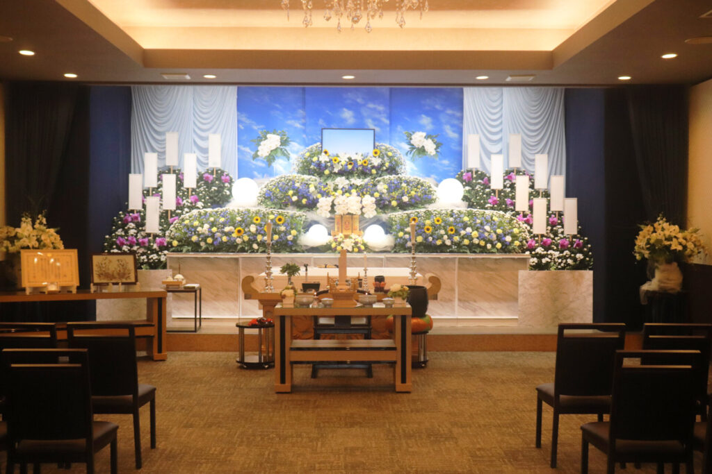 ご家族のご要望を受け、ご親族中心の家族葬を執り行いました。故人様がお好きだったお色味を基調に生花祭壇をお飾りし、季節の花々をあしらい彩りを添えました。また、多くのご供花を賜り、式場全体がお花の優しい香りに包まれておりました。華やかさとあたたかさに満ちた雰囲気の中、ご出棺となりました。
