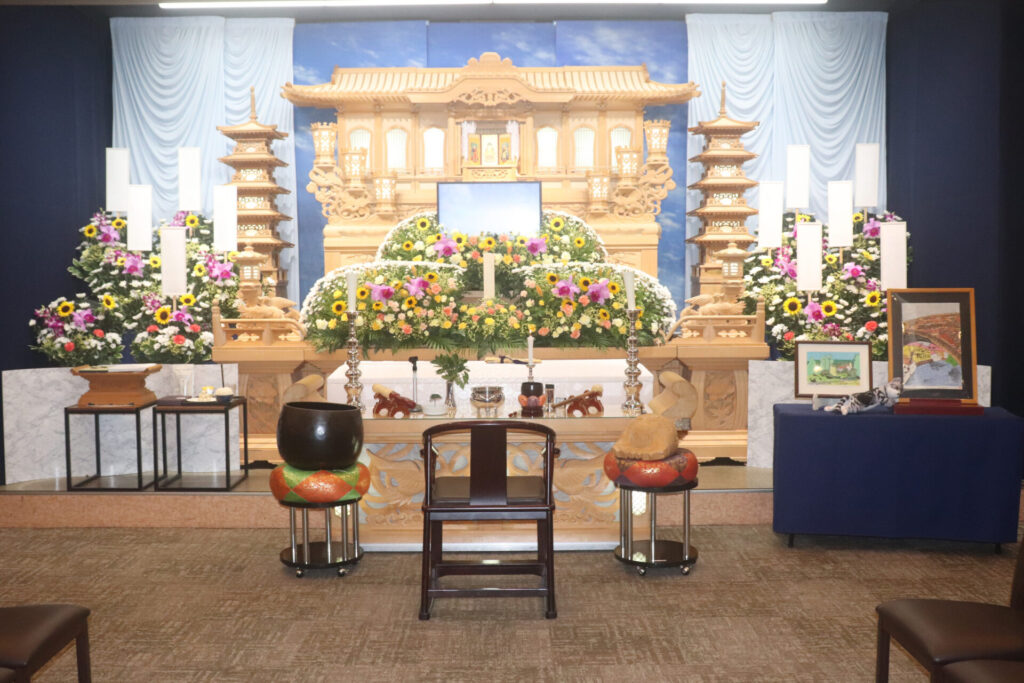 故人様は病院にてご逝去されました。ご遺族の「一度ご自宅へ連れて帰りたい」というお気持ちを受け、短い時間ではありましたが、ご自宅でお過ごしいただきました。その後、弊社霊安施設にてご安置し、葬儀当日は故人様がお好きだったひまわりを中心に、色とりどりの花々で祭壇をお飾りしました。明るく華やかな雰囲気の中、ご家族や多くのご友人に見守られながら、あたたかなお見送りとなりました。