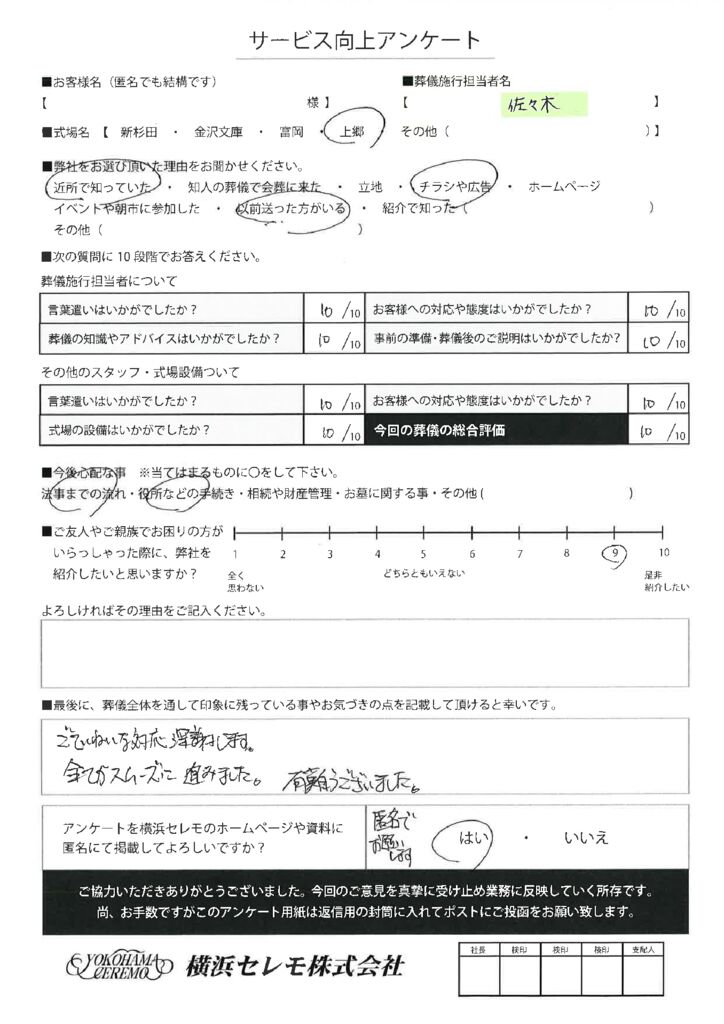 横浜セレモでは、ご利用頂いた皆様のご意見・評価をお聞かせ頂き、真摯に受け止め業務に反映していく所存です。