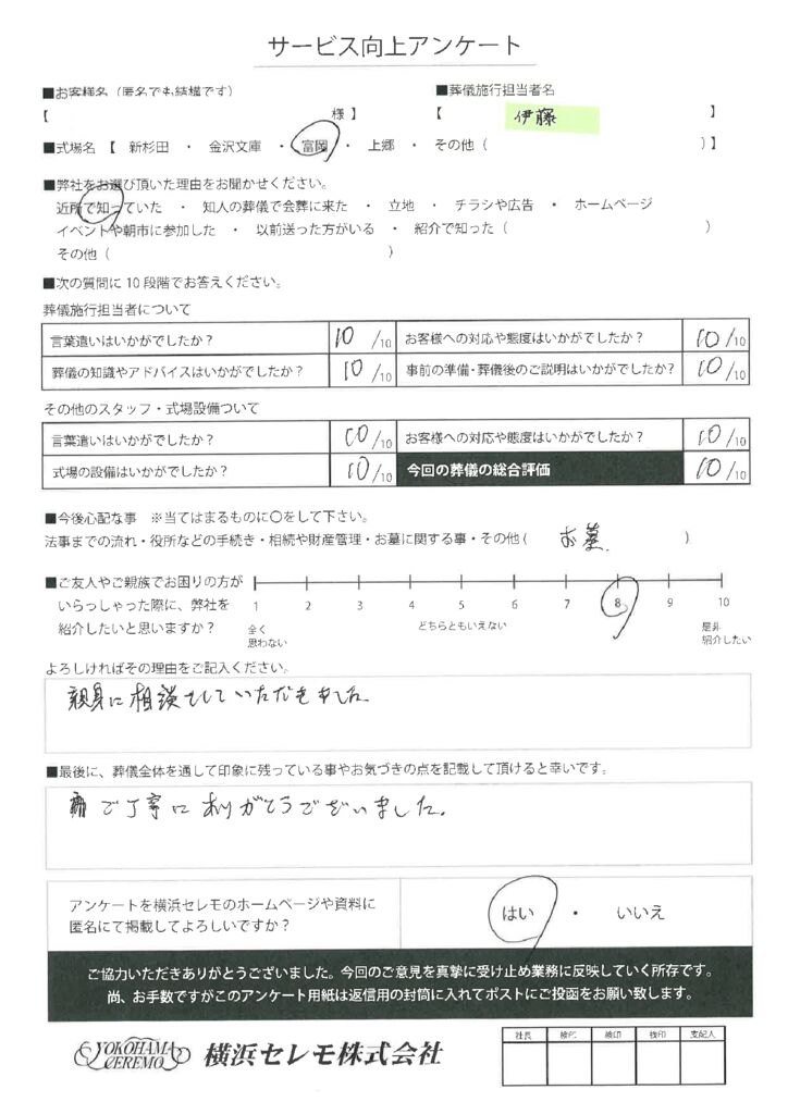 横浜セレモでは、ご利用頂いた皆様のご意見・評価をお聞かせ頂き、真摯に受け止め業務に反映していく所存です。