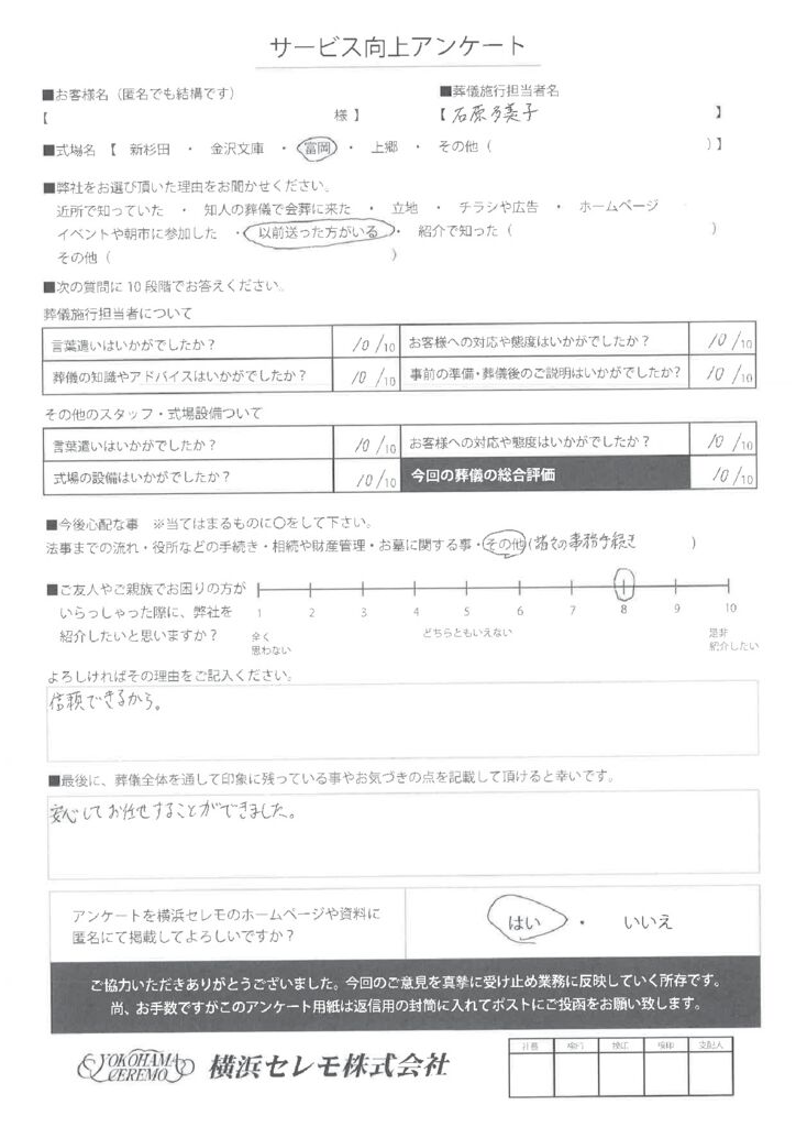 横浜セレモでは、ご利用頂いた皆様のご意見・評価をお聞かせ頂き、真摯に受け止め業務に反映していく所存です。
