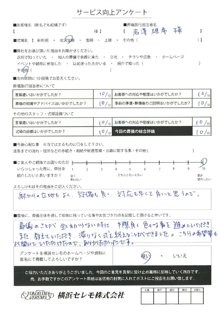 横浜セレモでは、ご利用頂いた皆様のご意見・評価をお聞かせ頂き、真摯に受け止め業務に反映していく所存です。