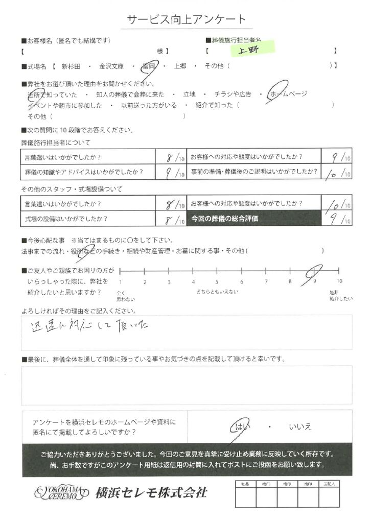 横浜セレモでは、ご利用頂いた皆様のご意見・評価をお聞かせ頂き、真摯に受け止め業務に反映していく所存です。