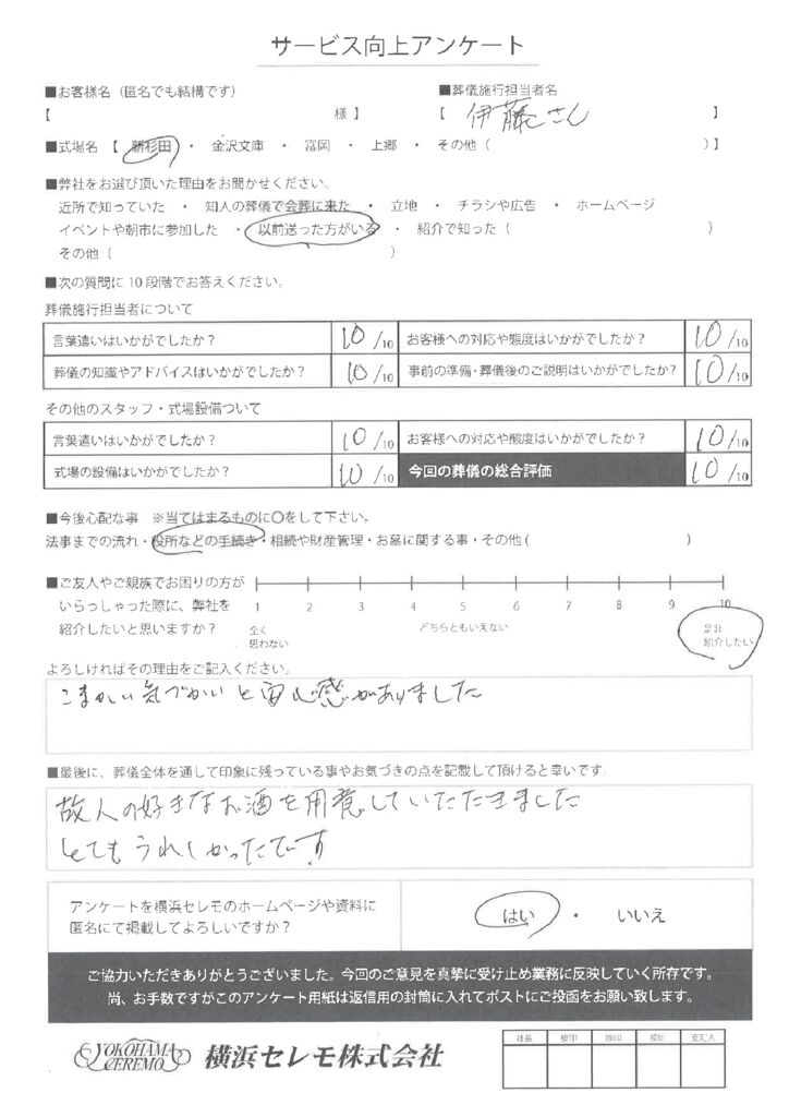 横浜セレモでは、ご利用頂いた皆様のご意見・評価をお聞かせ頂き、真摯に受け止め業務に反映していく所存です。