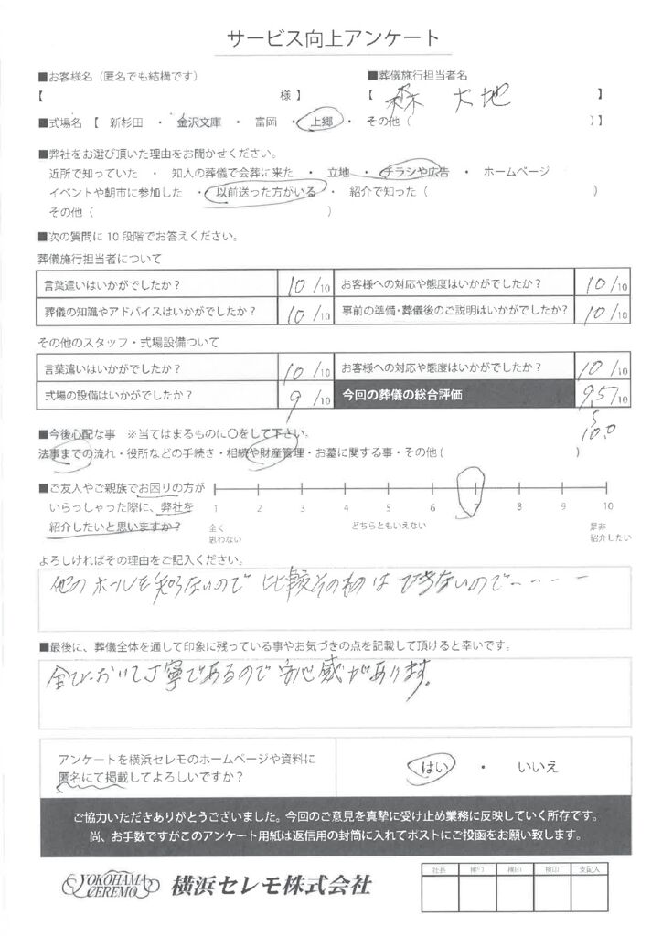 横浜セレモでは、ご利用頂いた皆様のご意見・評価をお聞かせ頂き、真摯に受け止め業務に反映していく所存です。