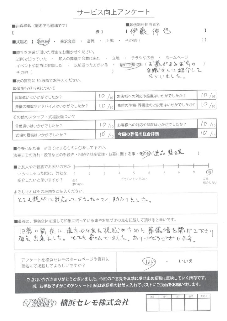 横浜セレモでは、ご利用頂いた皆様のご意見・評価をお聞かせ頂き、真摯に受け止め業務に反映していく所存です。