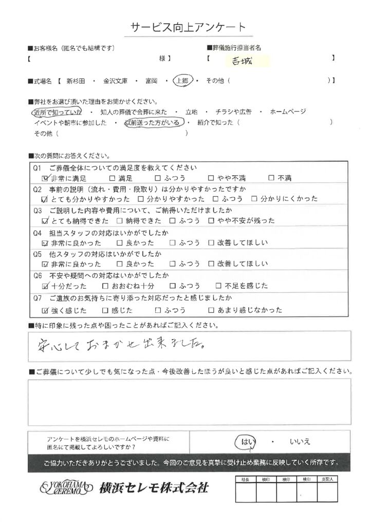 横浜セレモでは、ご利用頂いた皆様のご意見・評価をお聞かせ頂き、真摯に受け止め業務に反映していく所存です。